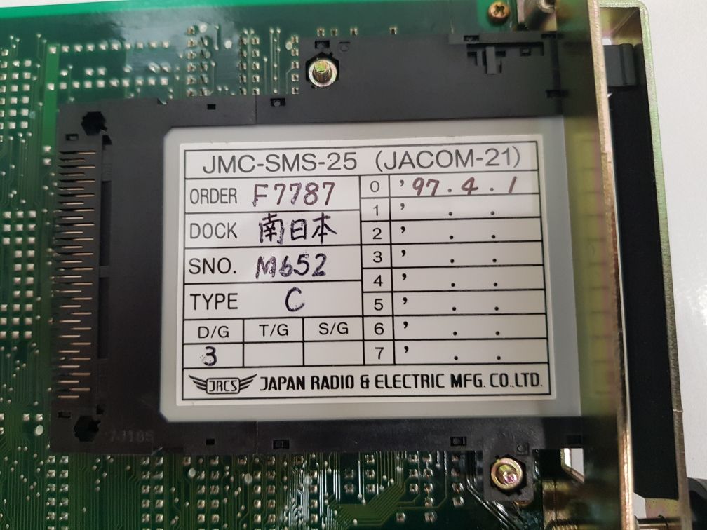 Jrcs Gms-m01A Pcb CardJrcs–Japan Radio & Electric Mfg.Co., Ltd.Cpu Gms-m01ACru-0512S120Jmc-sms-25 (Jacom-21)Type: CV2.09/Vz.0998BWeight: 530 Gm