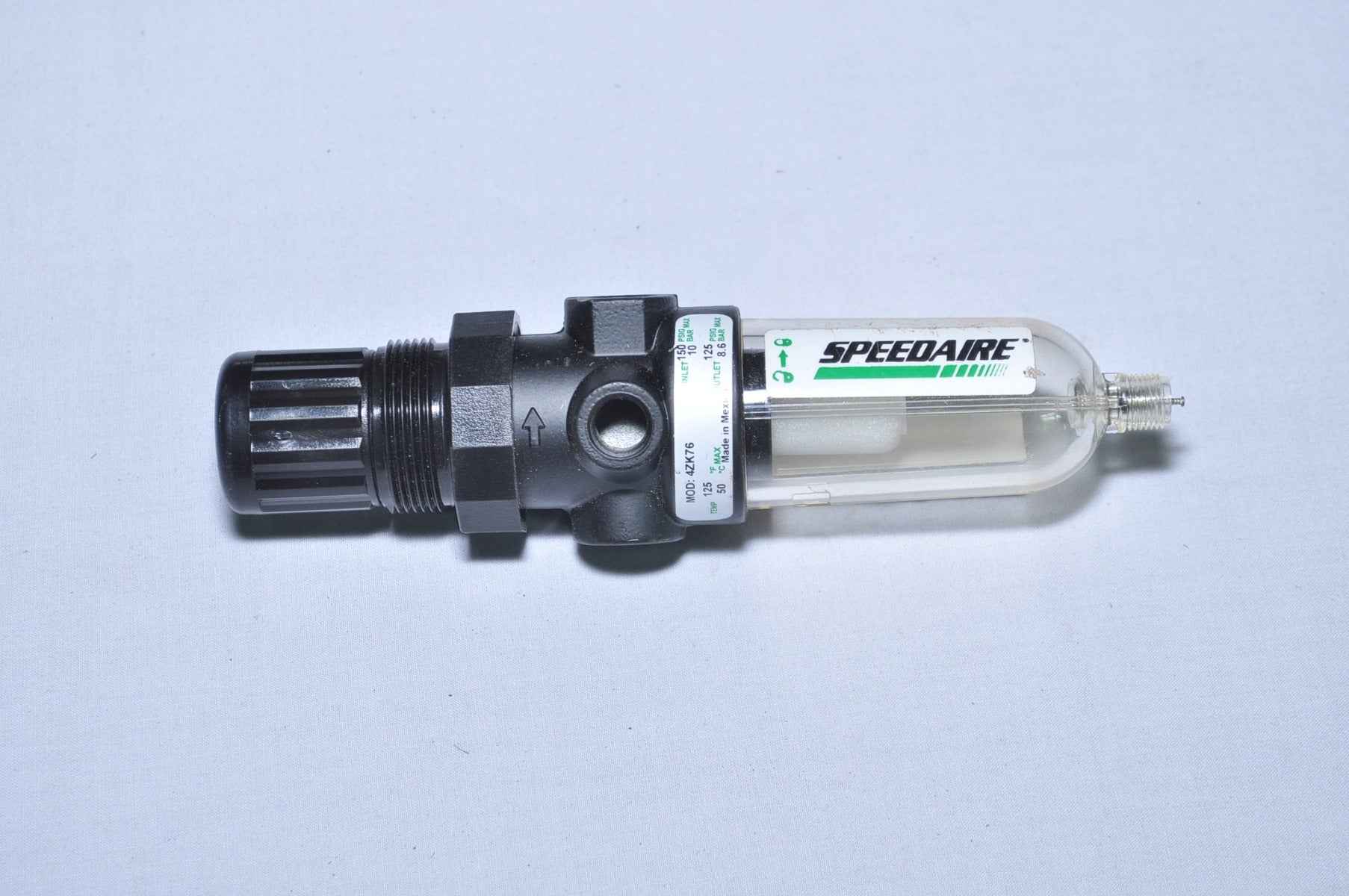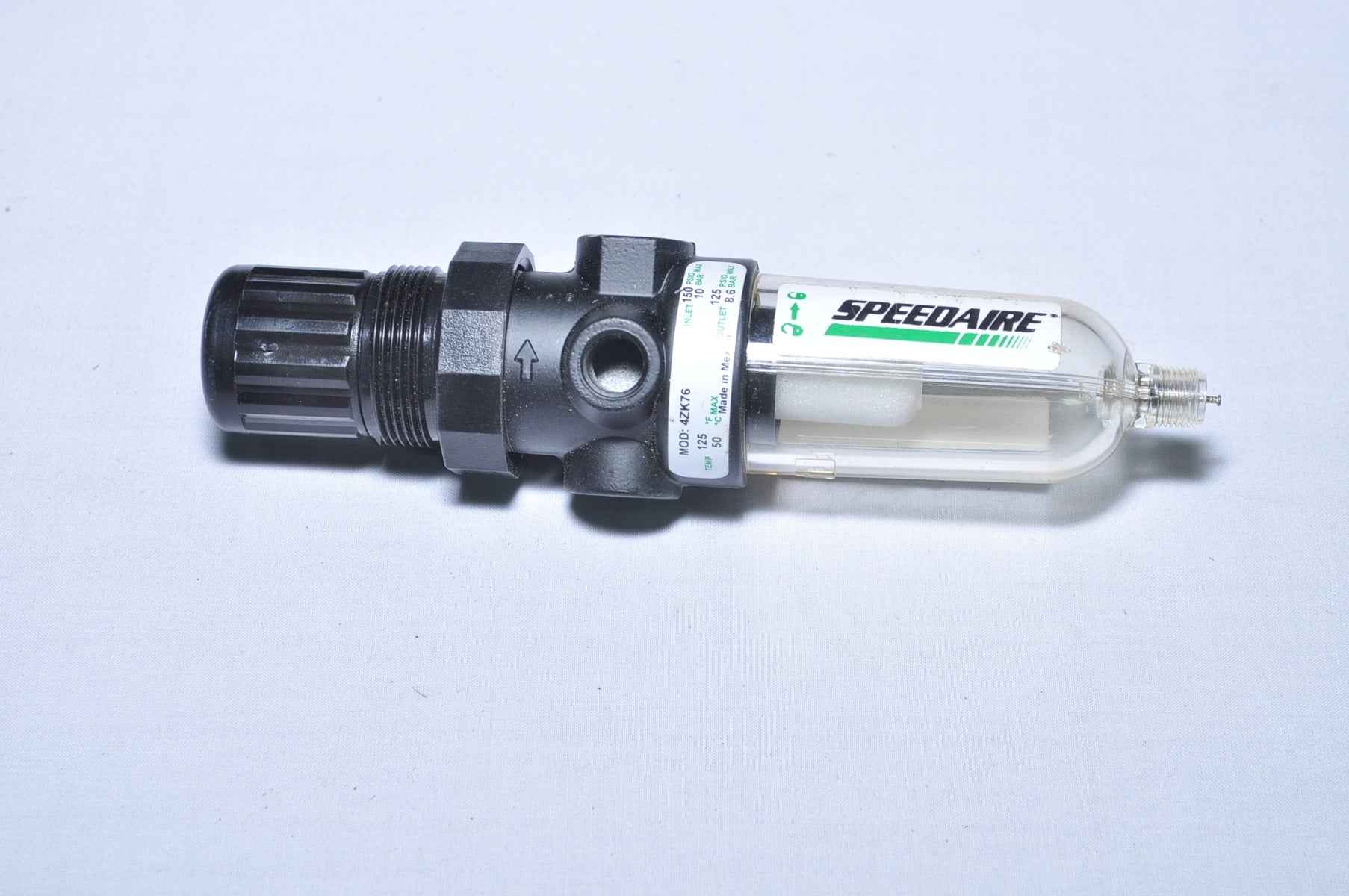Speedaire 4Zk76 Filter Regulator With Pressure Gauge 0-160 Psi Mod: 4Zk76 Temp: 125’f And 50’c Inlet: 150 Psig And 10 Bar Outlet: 125 Psig And 8.6 Bar Preasure Guaze 160 Psi, 11 Bar And Mpa 1.1