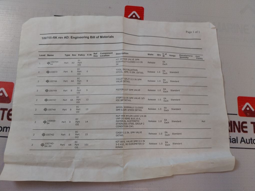 Oceaneering Parker Hannifin 100755-rk Valve Repair Kit