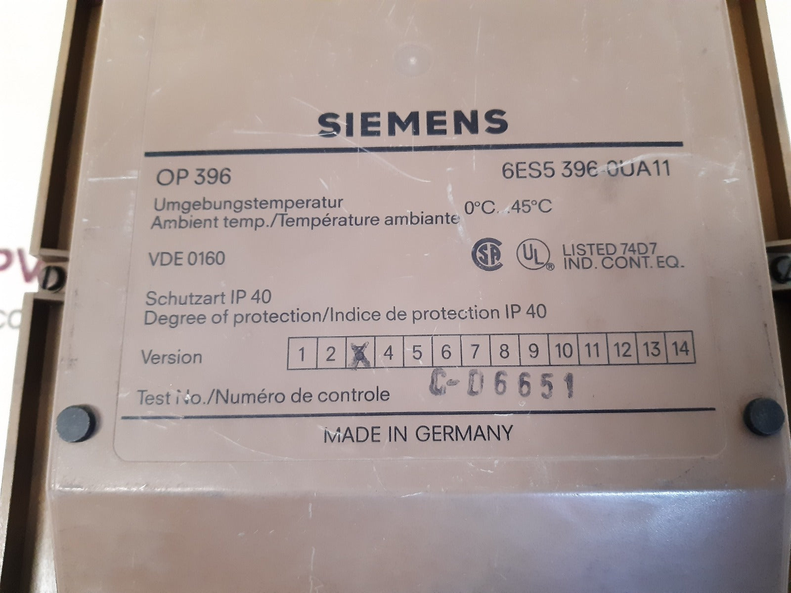 Siemens Simatic Op396 6Es5 396 0Ua11 Operator Panel